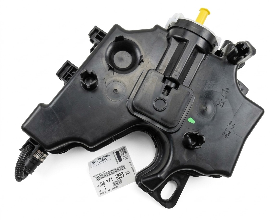 Dieser Tank enthält das FAP-Additiv (meist Eolys PowerFlex), welches dem Kraftstoff automatisch beigemischt wird. Es ist das "Geheimrezept" von PSA, um die Verbrennungstemperatur des Rußes im Partikelfilter drastisch zu senken. Besonders beim Citroën C5 Aircross, der auf der modernen EMP2-Plattform basiert, ist dieses System fein justiert. Da die Dosierpumpe fest im Tankgehäuse integriert ist, führt ein elektrischer Defekt der Pumpe oder ein Sensorfehler fast immer zum Austausch der kompletten Einheit. Nur das Originalteil garantiert hier die exakte Kommunikation mit dem Motorsteuergerät über den CAN-Bus.